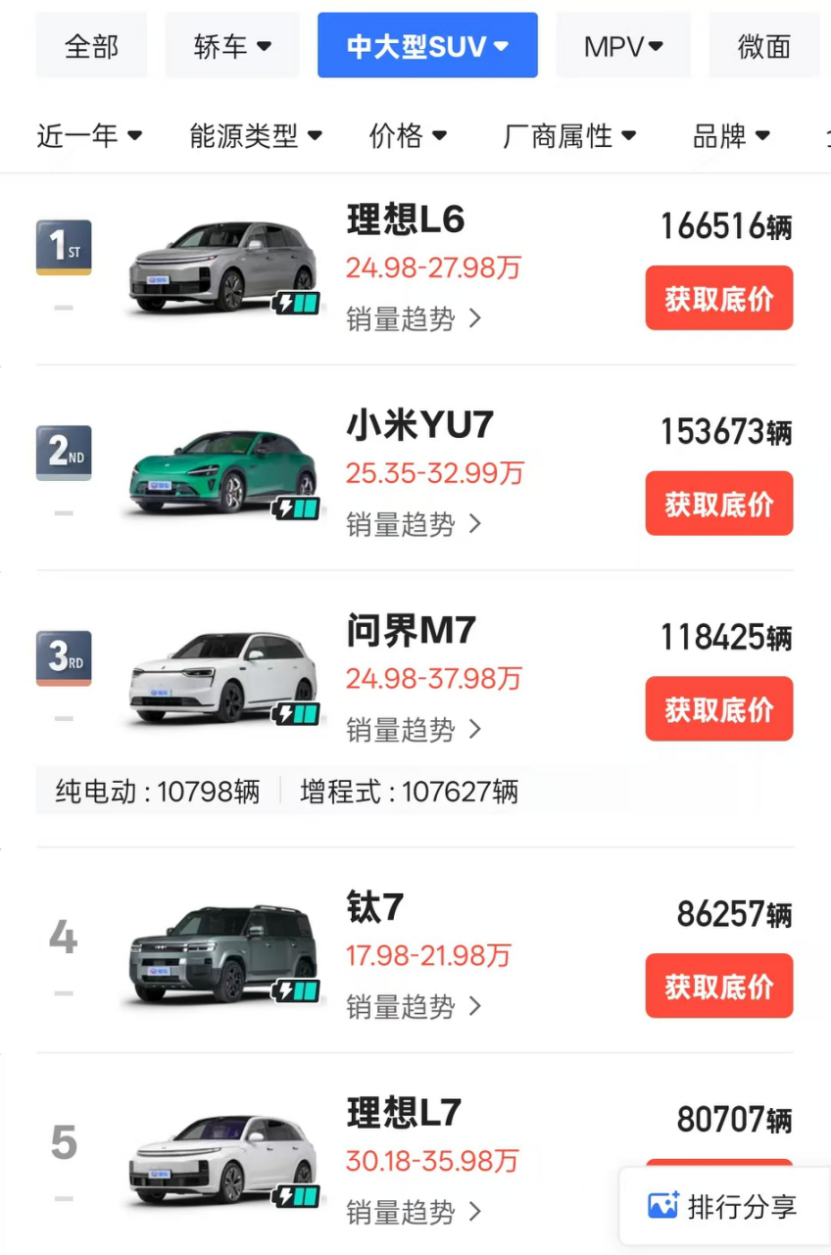 单看去年12月榜单的话,中大型SUV排名前三的分别是小米YU7(39089辆)、方程豹钛7(34086辆)、问界M7(29368辆),都是月销3到4万辆的超级爆款。