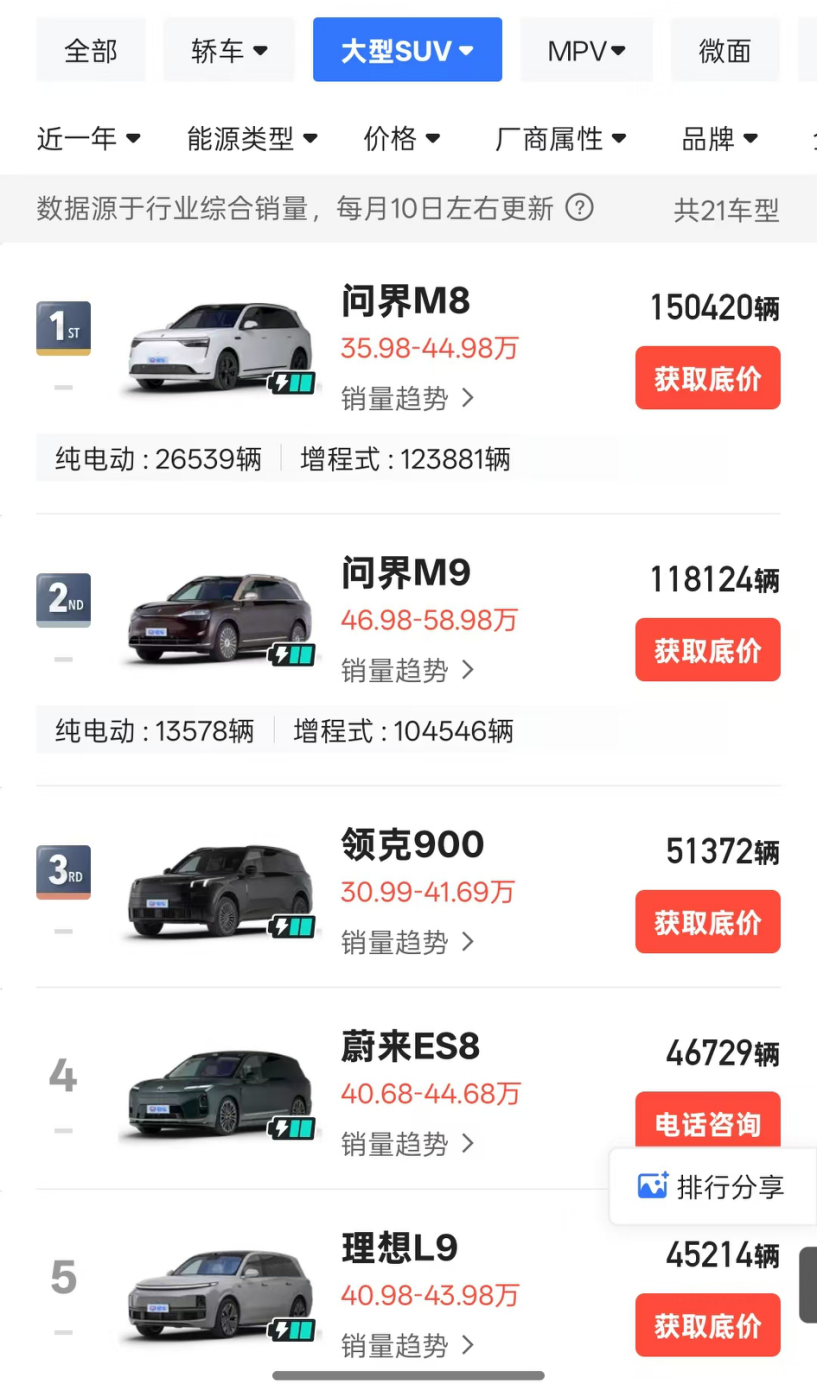 2025年,是大型SUV市场的爆发元年,此前该级别的可选车型非常少,2024年全年销量超过1万辆的只有问界M9和理想L9两款车。而2025年的大型SUV销量榜中,Top 10车型累计销量全部超过1万辆,其中问界M8和M9销量均超10万辆,M8超越M9拿下细分市场销冠。