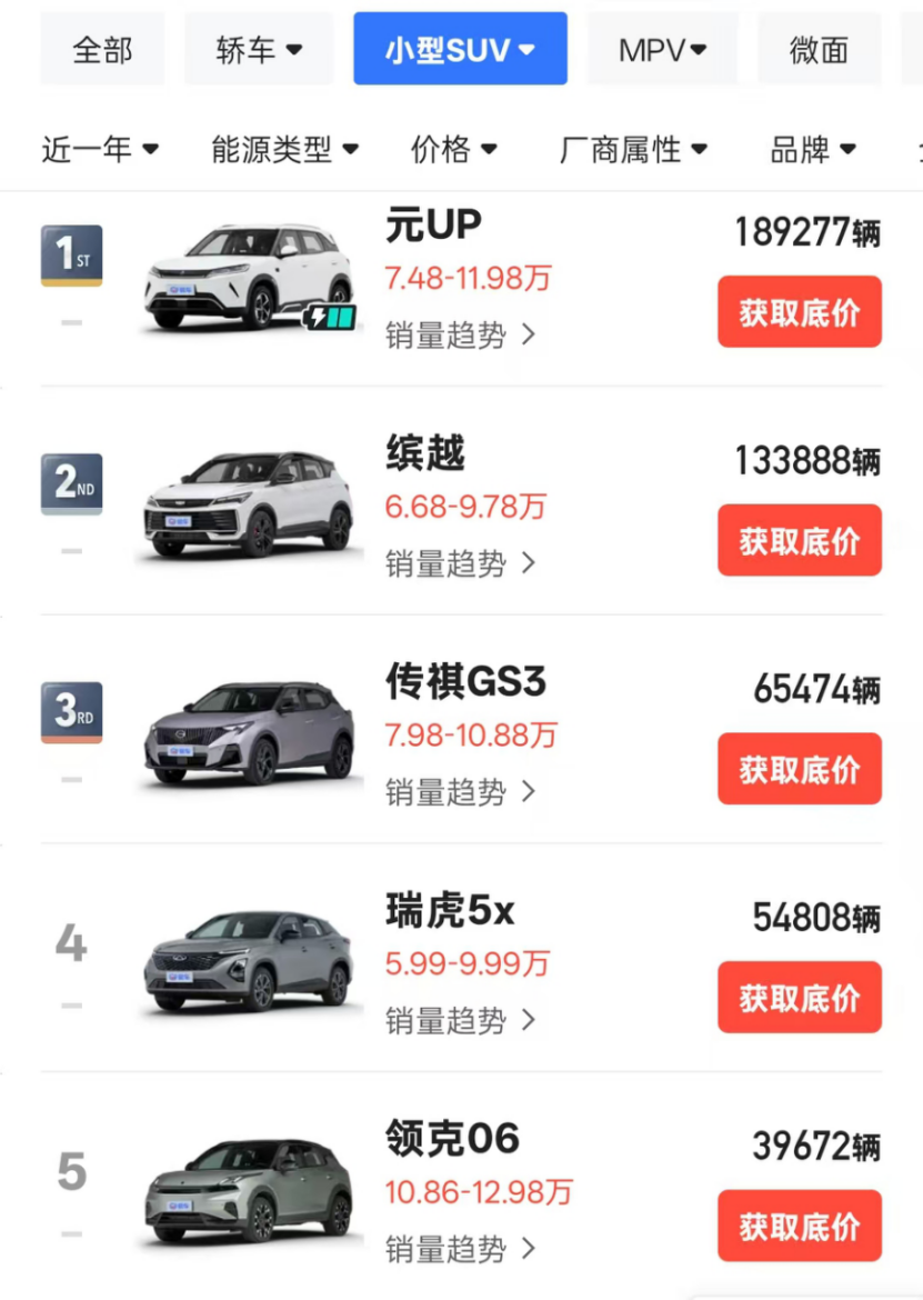 2024年小型SUV销量最高的3款车型,分别是元UP、缤越和传祺GS3,而2025年该级别的To3依然是这3款,且排名都没有变化,只是2024年排第四的领克06,今年滑落到了第五名。