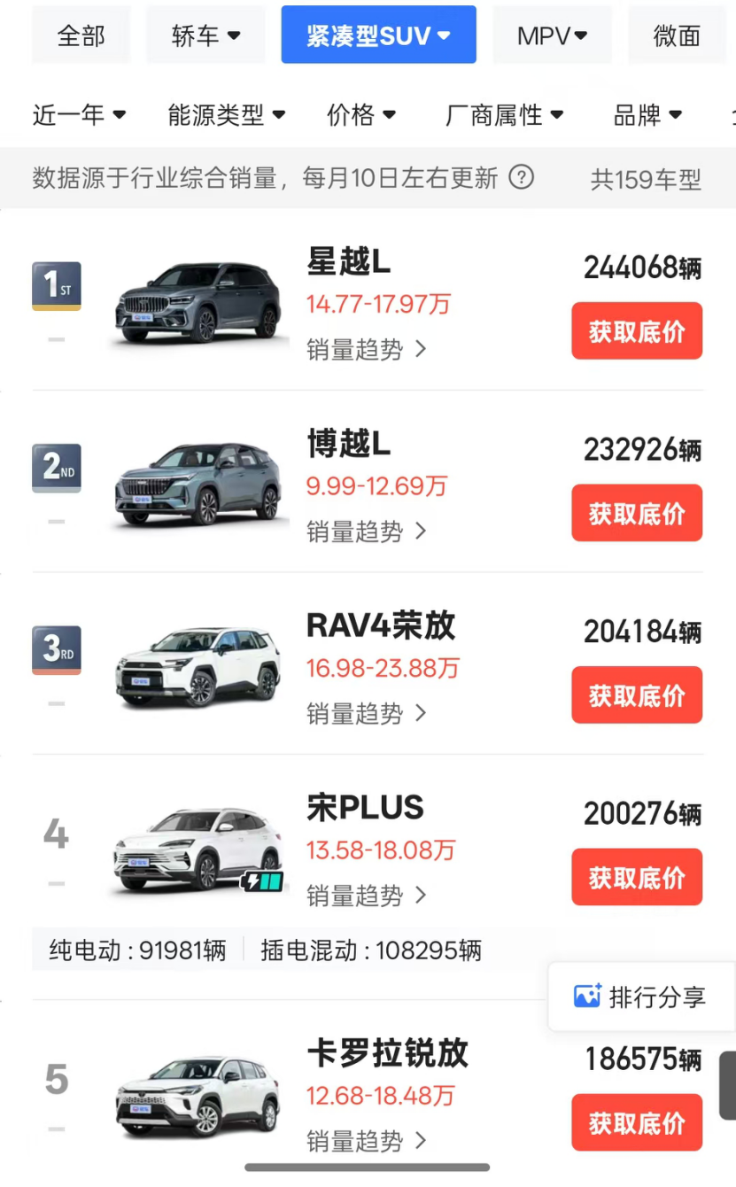 2024年的紧凑SUV销量榜Top 3,全部都是比亚迪的新能源车型,而2025年的榜单格局则发生巨变,比亚迪此前的超级爆款宋PLUS已经跌出Top 3,吉利旗下星越L、博越L拿下冠亚军,再加上第三名的丰田RAV4,前三款SUV均为燃油车。